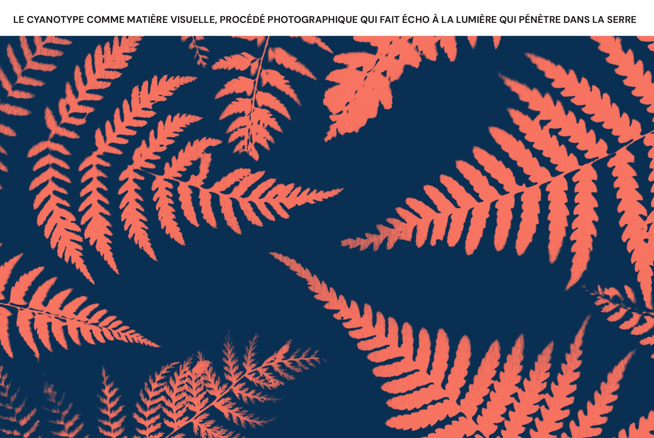 Vous pourrez apprécier les cyanotypes colorés, qui viennent enrichir notre imaginaire visuel. Ces images et jeux de transparence font référence au procédé photographique permettant de produire un tirage bleu sur un support photosensible, rappelant la lumière qui fera bientôt rayonner la Serre à travers le 18ème !